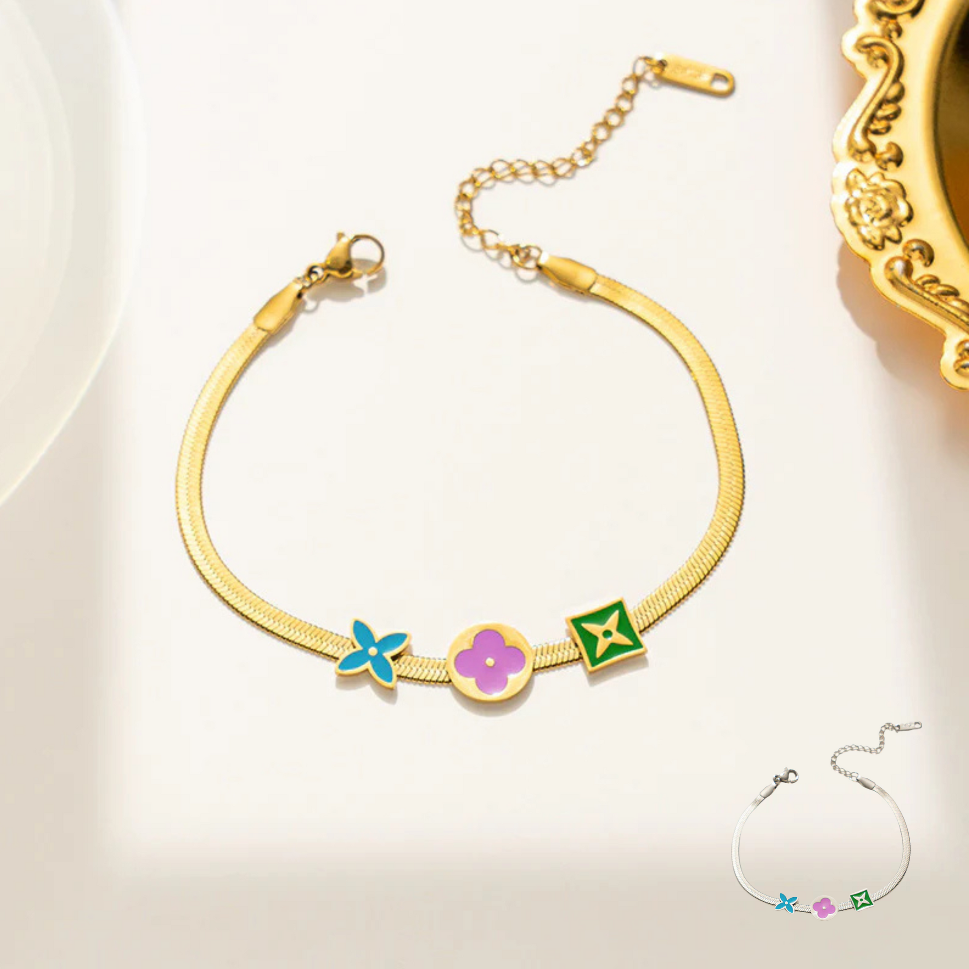Add a pop of color to your look with our Bright Floral Silver or Gold Bracelet. Featuring a playful floral design, this bracelet is sure to make a statement and brighten up any outfit. Available in silver or gold, it's the perfect accessory for your next night out (or day in, we're not judging).