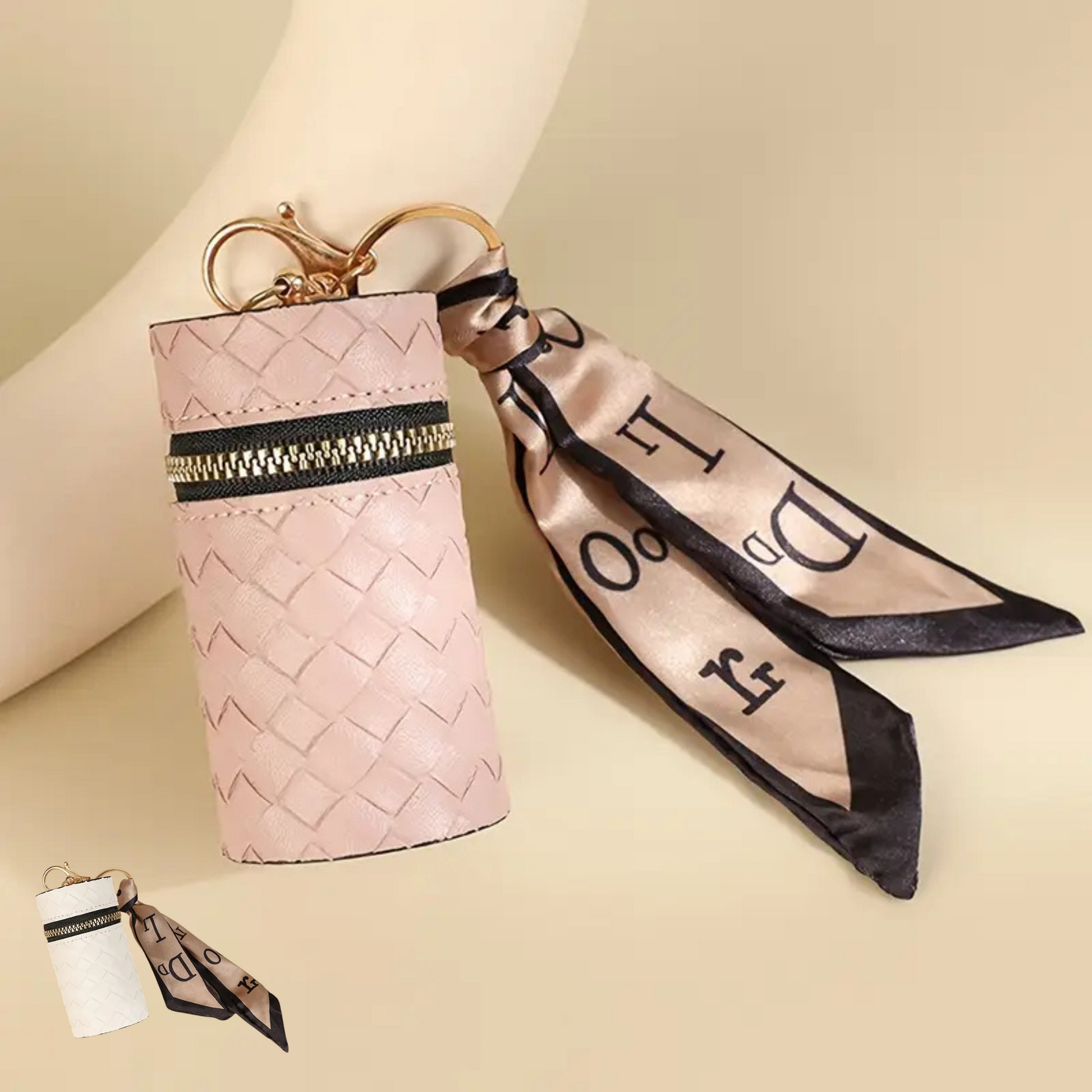 Add some style to your look with this chic Woven PU Leather Bucket Bag! Available in light blue, pink, and brown, it comes with a mini lipstick holder and keychain wallet for easy organization. Portable and trendy, its unique woven texture and scarf accent make it a must-have for fashionable women on the go!